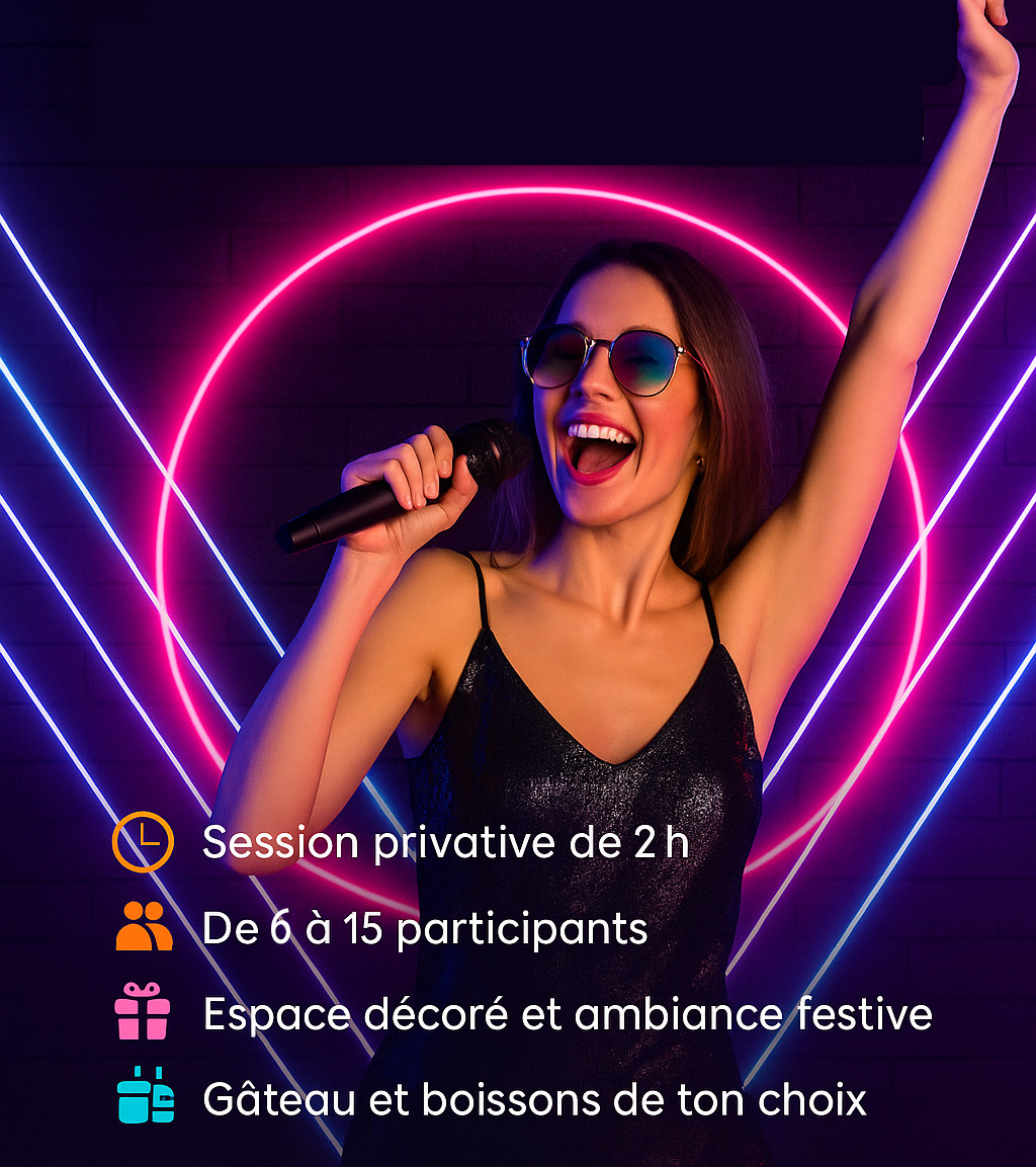 Chez Just-Karaoké, on te réserve 2 heures de pur fun dans une salle privative au décor néon et immersif, équipée d’un système son et vidéo professionnel. Choisis parmi des milliers de titres — des grands classiques aux tubes du moment — et deviens la star du micro le temps d’un moment inoubliable ! 🌟